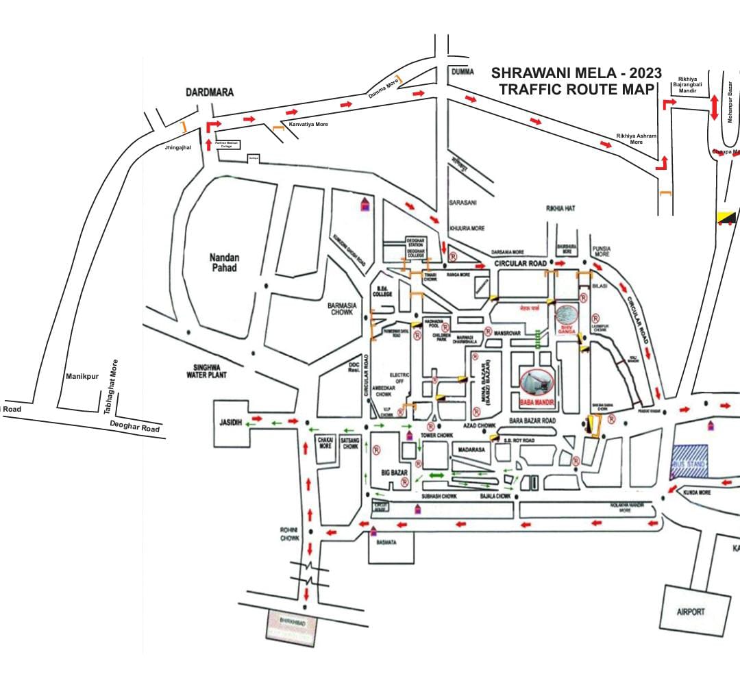 देवघर श्रावणी मेला 2023 के शुभारंभ के साथ पुलिस लगातार यातायात व्यवस्था पर कार्य कर रही है और व्यवस्था को और बेहतर बनाने के लिए प्रयतनशील है । इस संदर्भ में देवघर पुलिस निम्न बिंदुओं पर कार्य कर रही है: