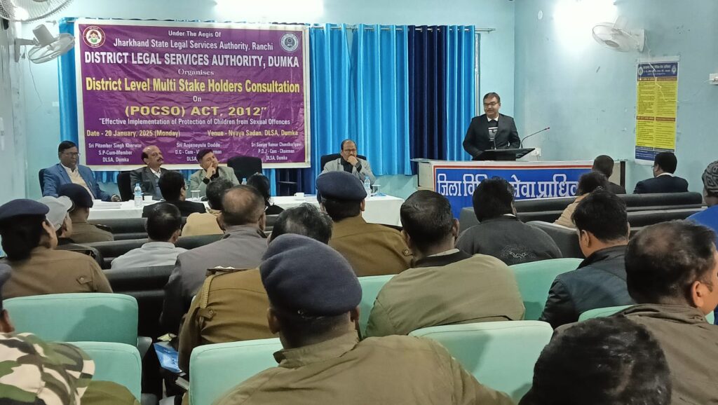 झालसा रांची के निर्देश पर जिला विधिक सेवा प्राधिकार, दुमका के अध्यक्ष संजय कुमार चन्द्धरियावी के आदेशानूसार आज न्याय सदन में पॉक्सो (POCSO )एक्ट के तहत डिस्ट्रिक्ट लेवल मल्टी स्टेक होल्डर कंसल्टेशन कार्यक्रम आयोजित किया गया। आयोजित कार्यक्रम मे जिला जज प्रथम, रमेश चंद्र, जिला जज द्वितीय प्रकाश झा, जिला जज तृतीय राजेश सिन्हा, जिला जज चतुर्थ धर्मेंद्र कुमार सिंह, जिला जज पंचम शत्रुंजय कुमार सिंह, डालसा सचिव, उत्तम सागर राणा, उपाधीक्षक, दुमका, आकाश भारद्वाज ने संयुक्त रूप से दीप प्रज्ज्वलित कर कार्यक्रम का विधिवत उदघाटन किया| कार्यक्रम मे POCSO एक्ट यानि प्रोटेक्शन ऑफ़ चिल्ड्रन फ्रॉम सेक्सुअल ऑफन्स एक्ट को लेकर विस्तार से चर्चा की गई।