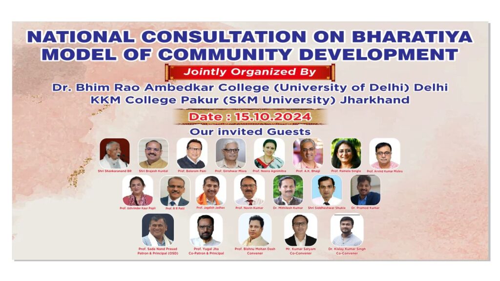 दिल्ली विश्वविद्यालय के डॉ. भीम राव अंबेडकर कॉलेज और एसकेएम विश्वविद्यालय के केकेएम कॉलेज द्वारा 15 अक्टूबर 2024 को ‘भारतीय मॉडल के सामुदायिक विकास’ पर एक राष्ट्रीय परामर्श का आयोजन किया जाएगा। इस कार्यक्रम का उद्देश्य सामुदायिक विकास के भारतीय मॉडल के विभिन्न पहलुओं को समझना और उसकी प्रासंगिकता पर चर्चा करना है।