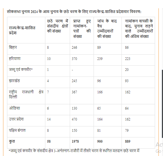 इस चरण में 7 राज्यों/केन्द्र-शासित प्रदेशों की 57 संसदीय क्षेत्रों के लिए होने वाले मतदान हेतु कुल 1978 नामांकन-पत्र दाखिल किए गए। सभी 07 राज्यों/केन्द्र-शासित प्रदेशों (जम्मू-कश्मीर के संसदीय क्षेत्र 3- अनंतनाग-राजौरी में स्थगित हुए मतदान को छोड़कर) के लिए छठे चरण के लिए नामांकन दाखिल करने की अंतिम तिथि 06 मई, 2024 थी। दाखिल किए गए सभी नामाकंन की जांच के बाद, 900 नामांकन वैध पाए गए। 3-अनंतनाग-राजौरी संसदीय क्षेत्र में तीसरे चरण में कुल 28 नामांकन दाखिल किए गए थे और 21 नामांकन वैध पाए गए थे।