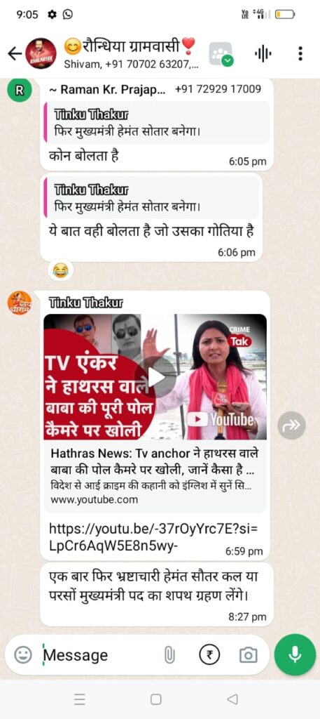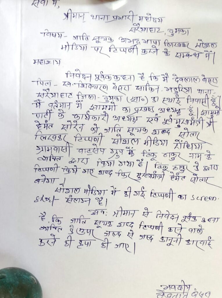 इस मामले को झारखंड मुक्ति मोर्चा सरैयाहाट प्रखंड अध्यक्ष देवलाल बेसरा ने सरैयाहाट थाना में एक लिखित शिकायत दी है कि सरैयाहाट थाना क्षेत्र के रौंधिया गांव के रहने वाले टिंकू ठाकुर ने व्हास्टएप ग्रुप में जातिसूचना शब्द का इस्तेमाल करते हुए लिखा है फिर मुख्यमत्री बनेगा। इसका स्क्रीन शार्ट भी पुलिस को उपलब्ध कराया गया है। इस मामले में आरोपी के खिलाफ कार्रवाई की मांग की गई है लेकिन अब तक कार्रवाई नहीं हुई है। क्या कहते है थाना प्रभारी इस मामले में सरैयाहाट थाना प्रभारी निरंजन कुमार ने बताया कि शिकायत मिली है उसकी जांच की जा रही है। इस मामले में आवश्यक कार्रवाई की जाएगी। फिलहाल इस मामले की गंभीरता से जांच की जा रही है।