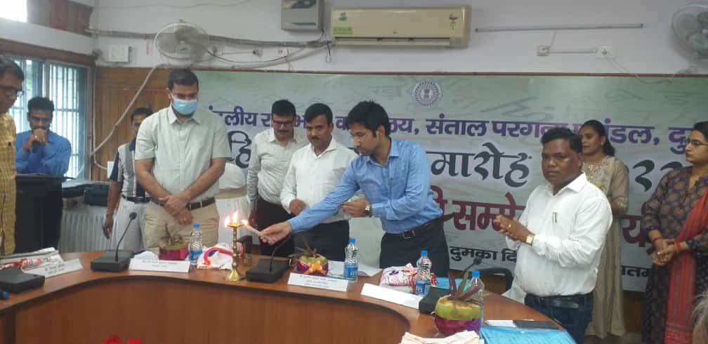 आयुक्त कार्यालय,संताल परगना के सभाकक्ष में प्रमंडलीय राजभाषा विभाग द्वारा हिंदी दिवस के अवसर पर विचार गोष्ठी सह कवि सम्मेलन कार्यक्रम का आयोजन किया गया। सर्व प्रथम मुख्य अतिथियों को पौधा देकर सम्मानित कर, कार्यक्रम का शुभारंभ दीप प्रज्वलित कर किया गया।